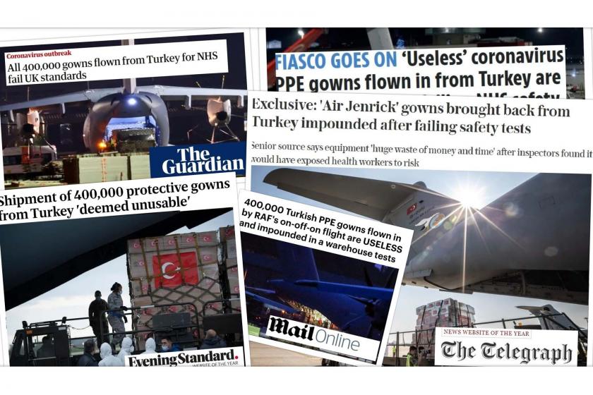Türkiye'deki yayın yapan bazı gazeteler ve yazarlar ile uluslararası medya organları; İngiltere hükümetinin, Türk yetkililerin temin ettiği 68 bin tulumun tamamının kalite testlerini geçtiğini açıklamasına rağmen ülkemizi hedef aldı. İngiliz Daily Telegraph Gazetesi'nin Türkiye'den gelen sağlık malzemesinin, gerekli standartları karşılamadığı için, Heathrow Havalimanı'ndaki depoda geri gönderilmek üzere bekletildiğine yönelik yalan haber paylaşıldı. İşte o paylaşımlar: