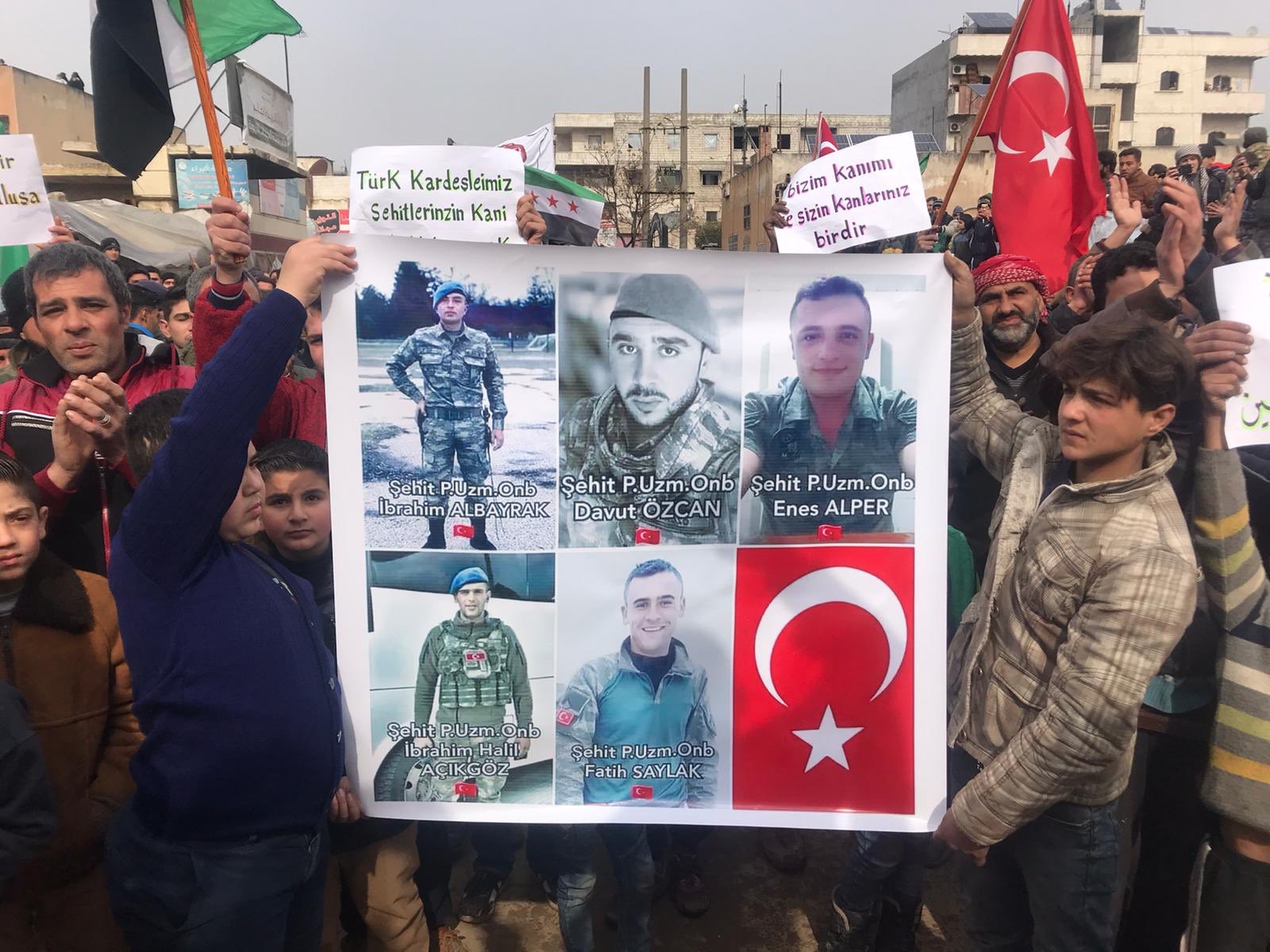 İdlib merkez ve ilçelerinde Türkiye'ye destek gösterileri yapan Suriyeliler, "Bizim kanımız sizin kanınızla birdir" yazılı pankart ve şehit düşen Mehmetçik'in fotoğraflarını ellerinde taşıdı.