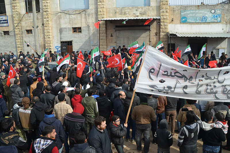 İdlibliler, Türkçe, Arapça ve İngilizce "Sivillerin korunması isteğimizdir", "Kurtarılmış bölgelere Türk kardeşlerimiz hoş geldiler" yazan dövizlerle İdlib'de şehit olan Türk askerlerinin fotoğraflarının olduğunu pankartlar taşıdı.