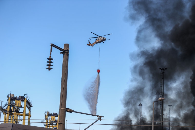 Limandaki konteynerlerde 6 Şubat'ta çıkan yangına dün Kara Kuvvetlerinin helikopterleri ile Hava Kuvvetlerinin uçağı müdahale etmiş ve uçaktan alevlere "yangın söndürme topu" da atılmıştı.