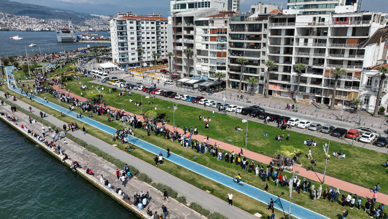 Liman kapısından başlayan ziyaretçi kuyruğu, hafta sonu ve güzel havanın da etkisiyle Gündoğdu Meydanına dayandı.