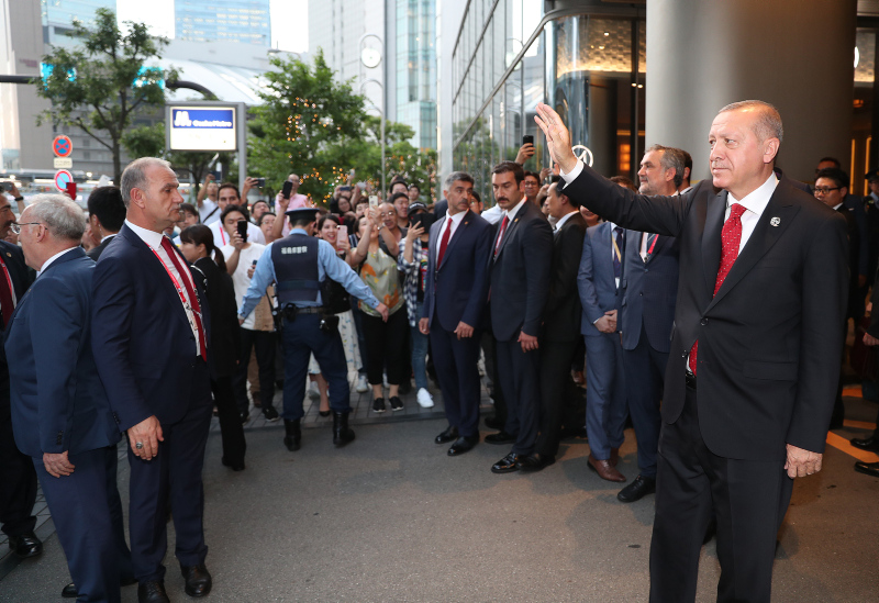 Cumhurbaşkanı Recep Tayyip Erdoğan ve eşi Emine Erdoğan, G20 Liderler Zirvesi için geldikleri Japonya'nın Osaka şehrinde otel çıkışı vatandaşları selamladı.