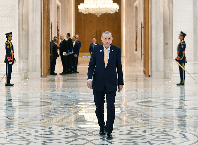 Salona girişinde Mısır Devlet Başkanı Abdülfettah es-Sisi tarafından karşılanan Başkan Erdoğan kendisini ayakta bekleyen liderlerle tek tek selamlaştı.