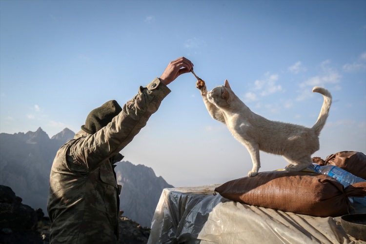 Hakkari'nin Yüksekova ilçesinin Irak sınırındaki dağlarda terör örgütü PKK'ya yönelik operasyonda bir mağarada bulunan iki kedi, Mehmetçiğe arkadaşlık ediyor.
