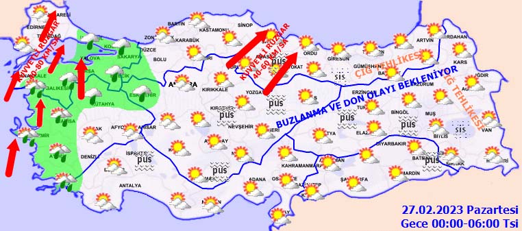 Meteoroloji'den yapılan açıklamaya göre, bugün (26 Şubat) ve yarın (27 Şubat) Marmara`nın batısında ve Kıyı Ege`de güney yönlerden kuvvetli rüzgar ve fırtına bekleniyor.