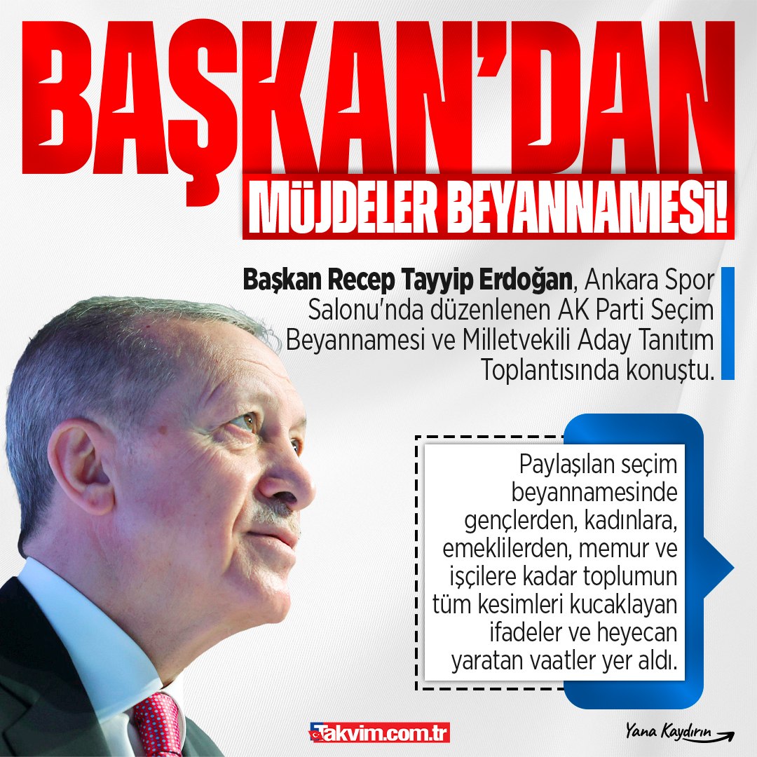 Başkan Recep Tayyip Erdoğan, Ankara Spor Salonu'nda gerçekleştirilen tanıtım toplantısında; toplumun her kesiminden insanları kapsayacak önemli müjdeleri paylaştı. Başkan Erdoğan toplantının ardından Twitter hesabından yaptığı açıklamada, müjdelerin bazılarını detaylarıyla duyurdu.