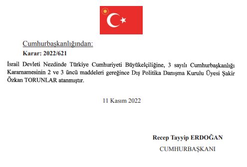 Başkan Recep Tayyip Erdoğan'ın imzasyıyla yayımlanan Resmi Gazete kararına göre, İsrail Devleti nezdinde Türkiye Cumhuriyeti Büyükelçiliğine, 3 sayılı Cumhurbaşkanlığı Kararnamesinin 2 ve 3. maddeleri gereğince, Dış Politika Danışma Kurulu Üyesi Şakir Özkan Torunlar atandı. Ayrıyeten Resmi Gazete'de yayımlanan kararda çok sayıda ilin müftülerin değiştiği belirtilirken, Çalışma ve Soyal Güvenlik Bakanlığı, İş Kurumu, Sosyal Güvenlik Kurumu gibi kurumlarda da yeni atamalar yapıldı.