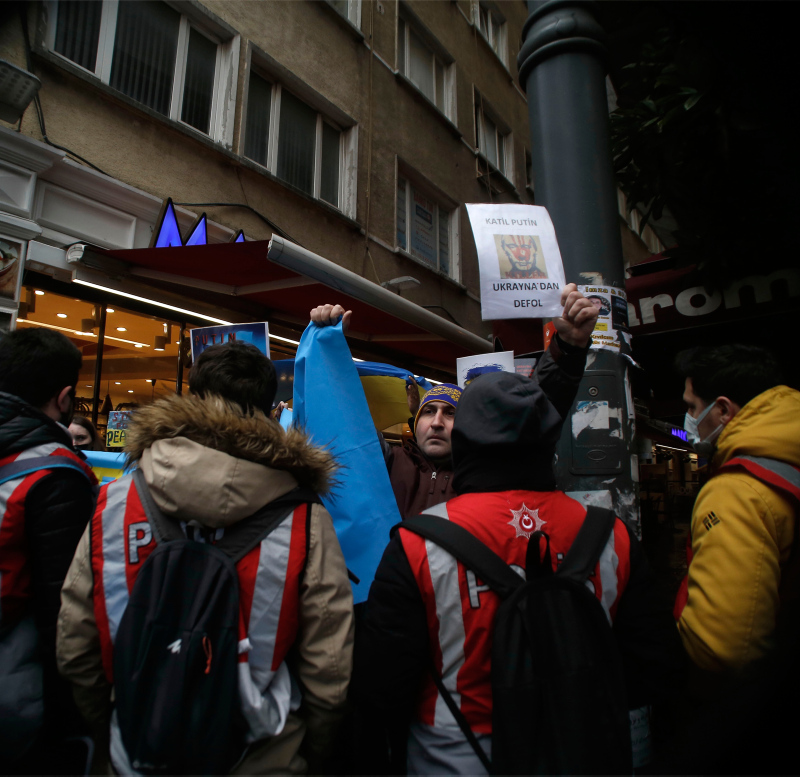 Rusya'nın askeri müdahalesini protesto etmek isteyen Ukraynalılar ve sivil toplum kuruluşu üyeleri, saat 10.00'da İstiklal Caddesi'ndeki Rusya İstanbul Başkonsolosluğu karşısında bulunan Gönül Sokak'ta bir araya geldi.