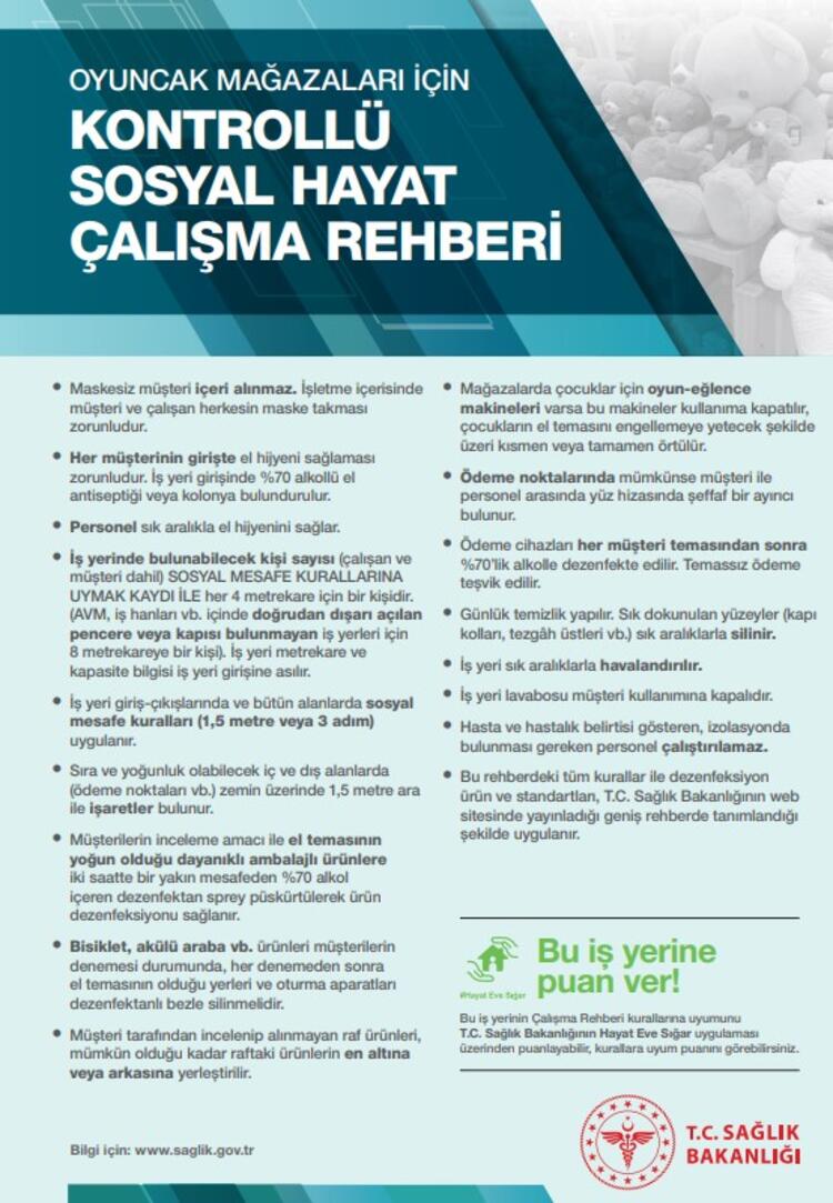 Normalleşme sürecinde kontrollü sosyal hayat döneminin başlamasıyla birlikte Sağlık Bakanlığı tarafından corona virüs (Covıd19) salgın yönetimi ve çalışma rehberleri kapsamında afişler iş yerlerine asılacak. AVM, market, kuaför, mağaza, kasap, manav gibi yerler için hazırlanan afişlerde uyulması gereken kurallar belirlendi.