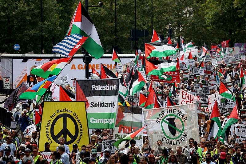 Filistin Dayanışma Kampanyası (PSC) İngiltere'nin başkenti Londra'da bugün Filistinlilere destek için protesto yürüyüşü düzenledi. PSC yürüyüşle ilgili, "Binlerce kişi Londra'da Ateşkes ve İngiltere'nin İsrail'in şiddetine suç ortaklığına son vermesi için yürüyor" açıklamasında bulundu.