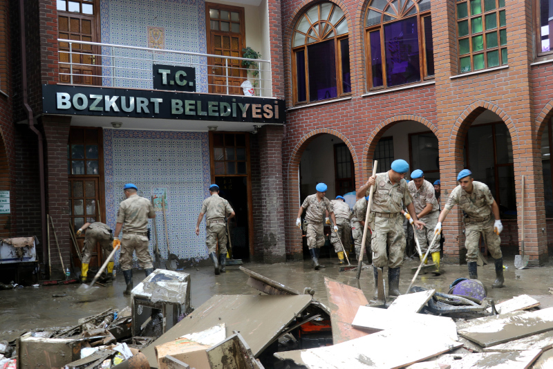 Caddede biriken ve iş yerlerine dolan çamur ve enkazın kaldırılması için çaba gösteren ekiplere, Kastamonu Jandarma Komando Eğitim Alay Komutanlığında görev yapan askerler ile bazı iş yeri sahipleri de destek veriyor.
