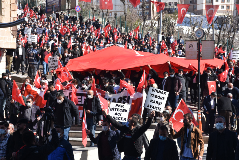 Irak'ın kuzeyindeki Gara bölgesinde, çeşitli tarihlerde terör örgütü PKK tarafından kaçırılarak, alıkoyulan ve şehit edilen asker, polis, sivil 13 kişi için Şırnak'ta sivil toplum kuruluşları, siyasi partilerin temsilcileri ve binlerce kişinin katılımıyla 'teröre lanet' yürüyüşü düzenlendi.