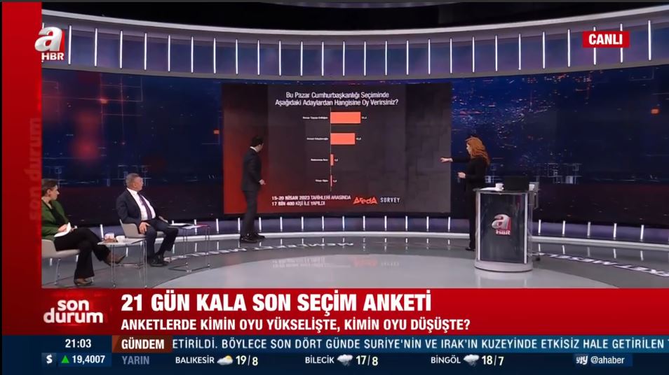 Areda Survey şirketinin 15-20 Nisan 2023 tarihleri arasında 17 bin 400 kişi ile yapılan seçim anketi sonuçları kamuoyu ile paylaşıldı. Siyasal İletişimci Ferhat Murat, yapılan son anketi A Haber ekranlarında paylaştı ve değerlendirdi.