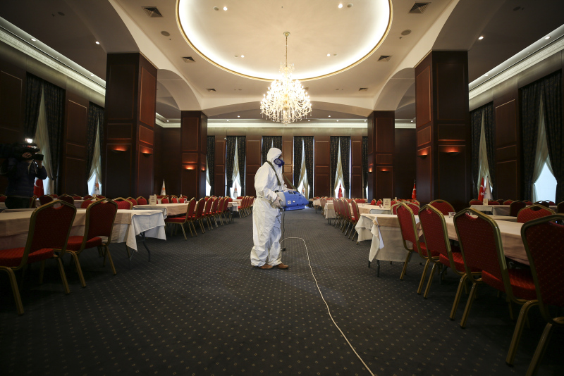 Bu kapsamda, özel kıyafetli ve maskeli ekiplerce AK Parti Genel Merkezi'nde çalışma odaları, toplantı salonları, koridorlar ve genel kullanım alanlarında dezenfeksiyon yapıldı. Gazetecilere de temizlik çalışması öncesinde tıbbi maske dağıtıldı.