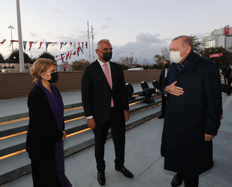 Başkan Erdoğan'ı AKM önünde, Kültür ve Turizm Bakanı Mehmet Nuri Ersoy karşıladı. Ersoy, AKM binasını gezen Erdoğan'a bilgi verdi.