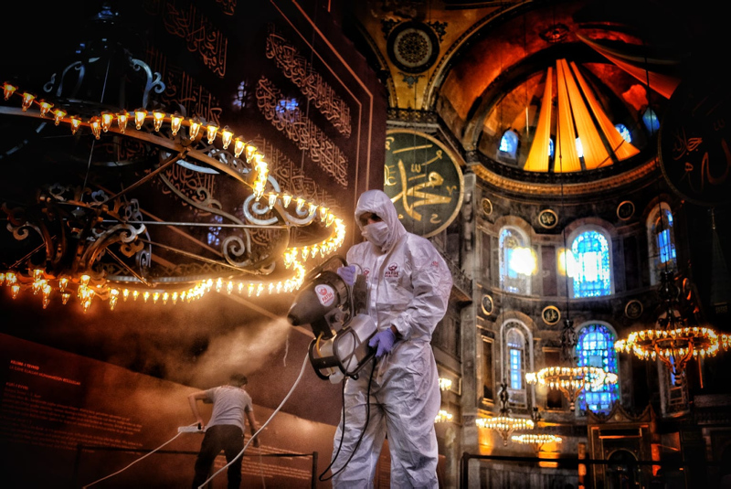 Ayasofya-i Kebir Cami-i Şerifi ve çevresinde, Fatih Belediyesi tarafından Kurban Bayramı arifesi dolayısıyla temizlik ve dezenfeksiyon çalışması yapıldı.
