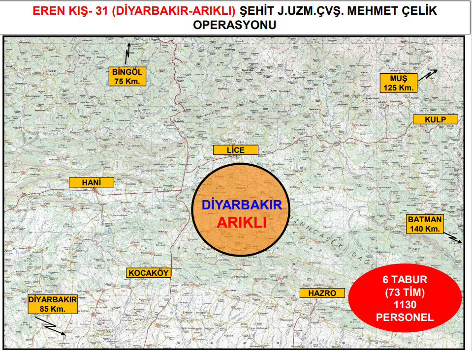 Bakanlıktan yapılan yazılı açıklamaya göre; PKK terör örgütünü ülke gündeminden çıkarmak ve bölgede barındığı değerlendirilen teröristleri etkisiz hale getirmek amacıyla Diyarbakır'da 'Eren Kış-31 (Diyarbakır-Arıklı) Jandarma Uzman Çavuş Mehmet Çelik Operasyonu' başlatıldı.