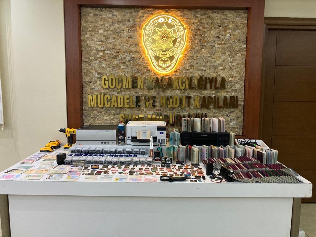 67 çalıntı Türkiye Cumhuriyeti Pasaportu, şüpheli F.S. adına hazırlanmış sahte Türkiye Cumhuriyeti Yeşil Pasaportu, farklı ülkelere ait olan ve Interpol (Uluslararası Polis Teşkilatı) tarafından çalıntı kaydı bulunan 110 pasaport, yerli ve yabancı 19 ehliyet, 40 kimlik kartı, 15 ikamet izni belgesi, farklı ülkelere ait basıma hazır altı boş kimlik kartı, farklı ülkelere ait 10 pasaport yaprağı, altı Şengen Vizesi, yine farklı ülkelere ait sekiz sağlık kartı, şüpheli M.M. adına hazırlanmış uluslararası koruma belgesi ve 20 bin 200 lira nakit para ele geçirildi.
