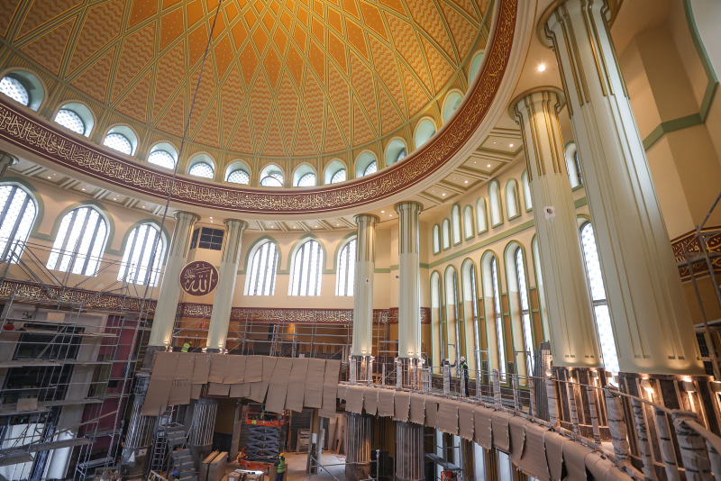 Her bir bölümü en ince ayrıntısına kadar düşünülen caminin içerisindeki boyama işlemlerinde sona gelindi. Namaz alanı ahşap duvar kaplamaları ve camlara korkuluk takma işleri tamamlanıyor. Caminin ana kubbesi için kurulan iskele de söküldü.