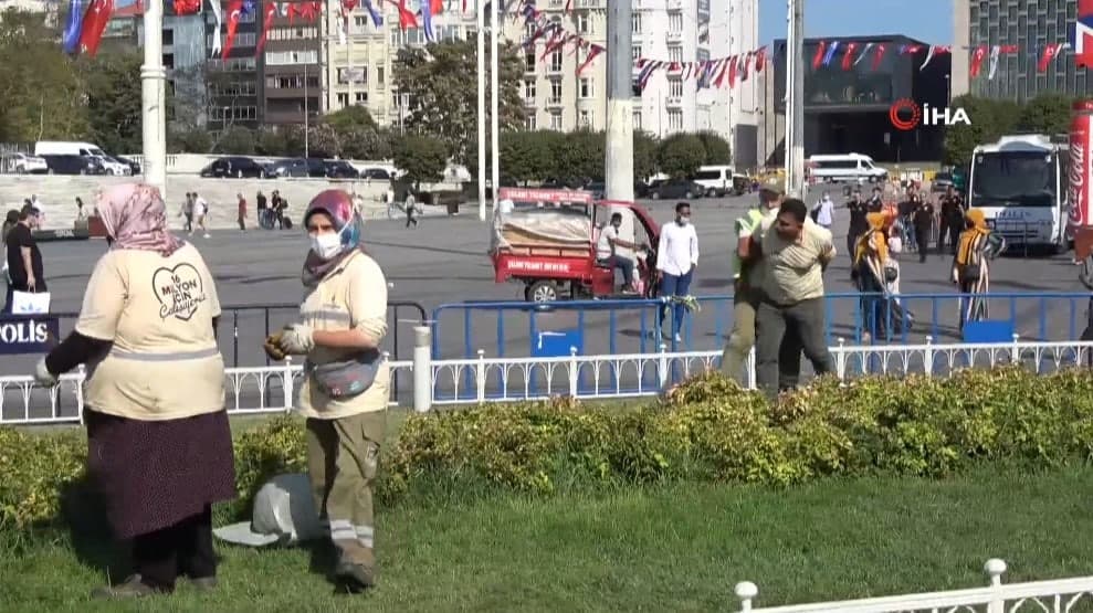 Meydanda peyzaj çalışması yapan İBB'nin mevsimlik işçilerinden birisi çöp toplama aracının şoförü ile tartıştı.
