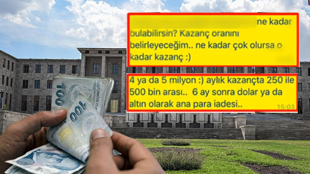 Dosyaya giren mesajlarda danışmanlardan birisinden 5 milyon TL istendiği ve aylık kazanç vaadinde bulunulduğu görüldü.