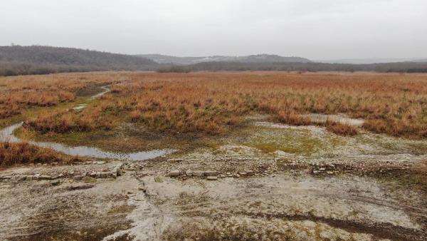 TERKOZ GÖLÜNDE METRELERCE SU ÇEKİLİNCE TARİHİ YOL ORTAYA ÇIKTI