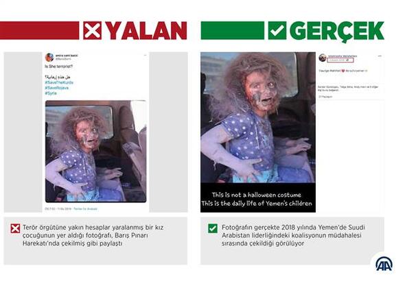 Bununla birlikte, Suudi Arabistan liderliğindeki koalisyonun Yemen'e müdahalesi sırasında yaralanmış bir kız çocuğunun yer aldığı Kasım 2018 tarihli fotoğraf karesini kullanan örgüt yanlısı bir kullanıcı, dezenformasyon yapma girişiminde bulundu.
