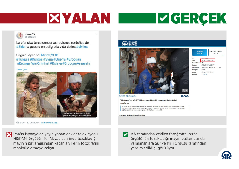 Türkiye'nin güney sınırında oluşturulmaya çalışılan terör koridorunu yok etmek, bölgeye barış ve huzur getirmek amacıyla başlatılan Barış Pınarı Harekatı aleyhine manipülasyon çabalarında, İran'ın İspanyolca yayın yapan devlet televizyonu HİSPAN, örgütün Tel Abyad şehrinde tuzakladığı mayının patlamasından kaçan sivillerin fotoğrafını çarpıtmaya çalıştı.