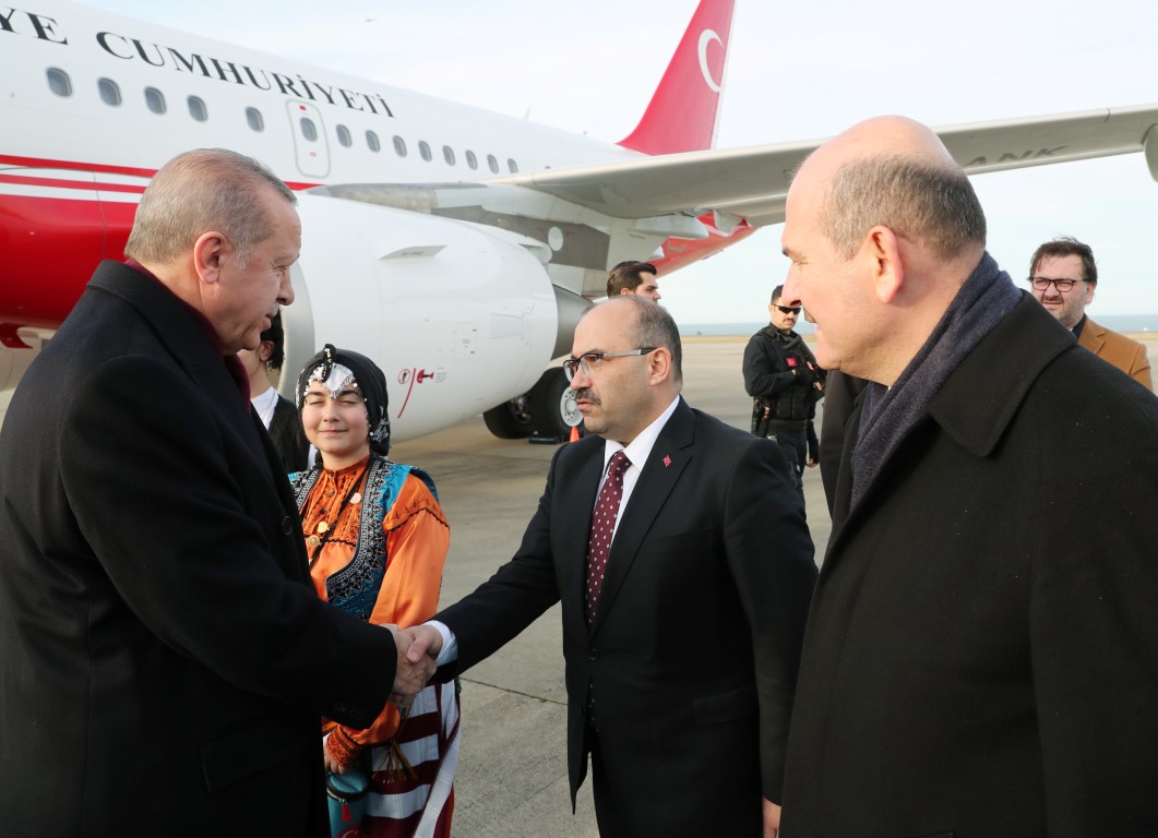Başkan Erdoğan'ı, İçişleri Bakanı Süleyman Soylu, Ulaştırma ve Alt Yapı Bakanı Mehmet Cahit Turhan, Ak Parti Genel Başkan Yardımcısı Hayati Yazıcı, Trabzon Valisi İsmail Ustaoğlu, Trabzon Büyükşehir Belediye Başkanı Orhan Fevzi Gümrükçüoğlu ile partililer karşıladı. Erdoğan'a yöresel kıyafetli iki genç, çiçek verdi.