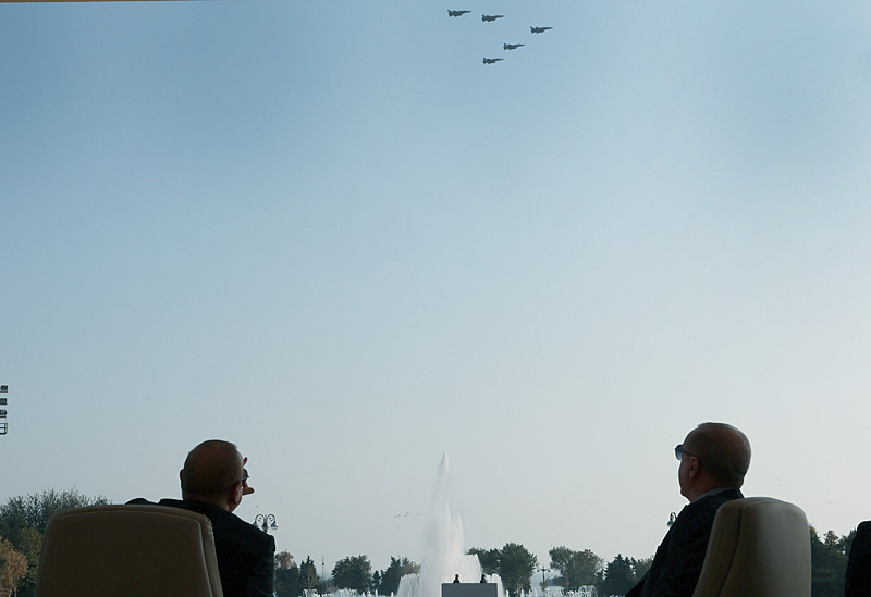 Azerbaycan'a ait helikopterler de Türkiye, Azerbaycan ve Pakistan bayraklarıyla donatılmış şekilde sahneye çıktı.