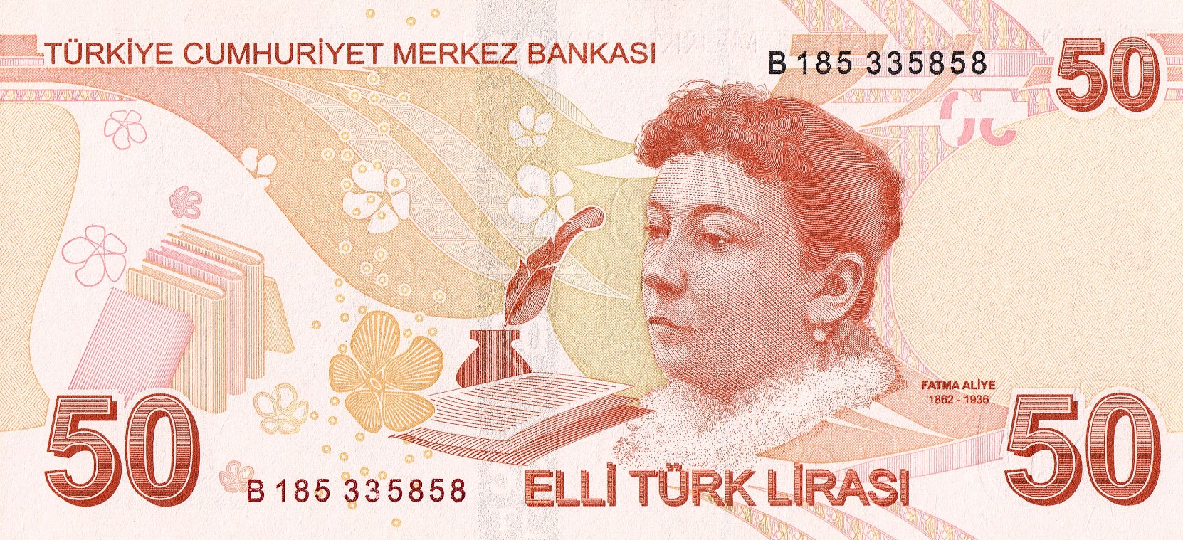 Türk edebiyatının ilk kadın romancısı Fatma Aliye Topuz'un portresi, 2009'dan bu yana elli liralık banknotların arka yüzünde yer alıyor.