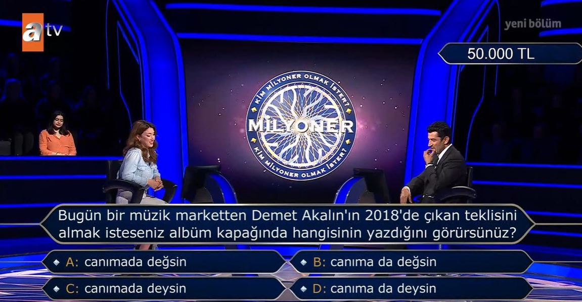 Milyoner'in yayınlanan son bölümünde "Bugün bir müzik marketten Demet Akalın'ın Demet Akalın'ın 2018'de çıkan teklisini almak isteseniz albüm kapağında hangisinin yazdığını görürsünüz?" sorusu kafaları karıştırdı.