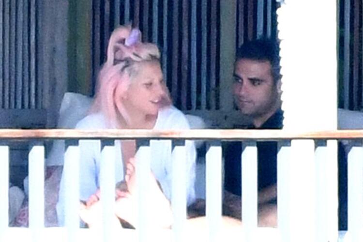 Tüm günü terasta öpüşerek ve güneşlenerek geçiren ikilinin rahat halleri dikkatlerden kaçmadı. Bir süre terastaki yatakta bornozuyla oturan Lady Gaga, daha sonra ise iç çamaşırıyla kaldı.