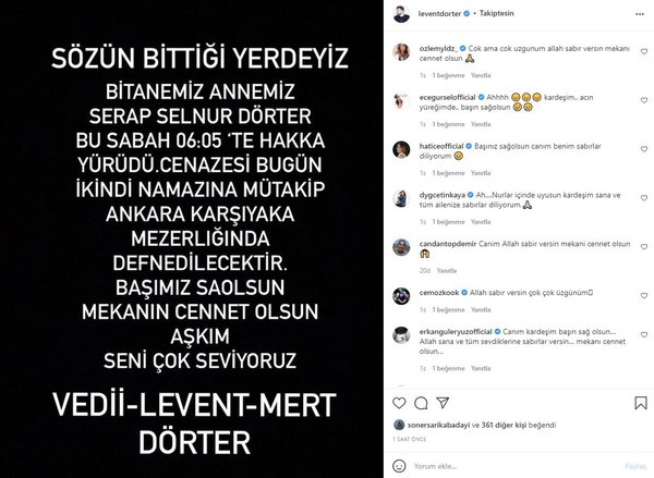 İbrahim Tatlıses'in kızı Dilan Çıtak ile aşk yaşayan şarkıcı Levent Dörter sosyal medya hesabından annesinin vefat haberini verdi. Dörter, üzüntüsünü, "Sözün bittiği yerdeyiz. Bitanemiz annemiz Serap Selnur Dörter bu sabah 06:05'te hakka yürüdü. Cenazesi bugün ikindi namazına mütakip Ankara Karşıyaka Mezarlığı'nda defnedilecektir. Başımız sağ olsun, mekanı cennet olsun. Aşkım seni çok seviyoruz." sözleriyle dile getirdi.