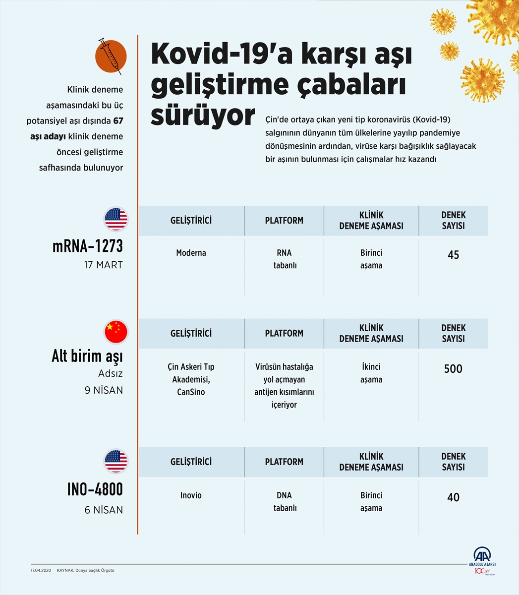 Çin Askeri Tıp Akademisi tarafından geliştirilen potansiyel aşının ikinci aşama klinik denemeleri salgının ortaya çıktığı Vuhan kentinde başladı. ABD'li ilaç şirketleri Moderna ile Inovio'nun ürettiği potansiyel aşıların da birinci aşama klinik denemeleri devam ediyor.