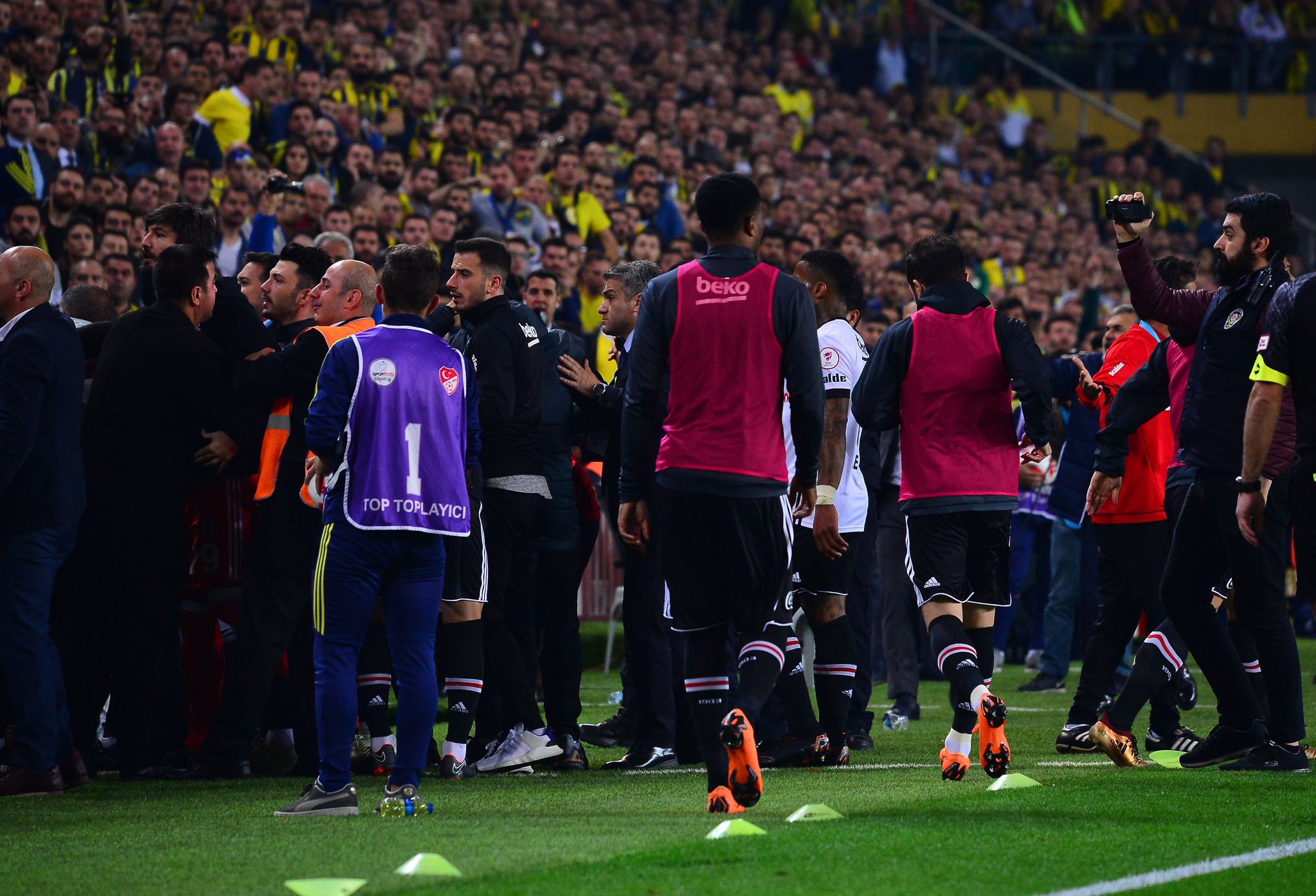 Fenerbahçe'nin Beşiktaş'ı ağırladığı maçta siyah-beyazlı takımın teknik direktörü Şenol Güneş'in başına yabancı madde atıldı, derbi durdu.