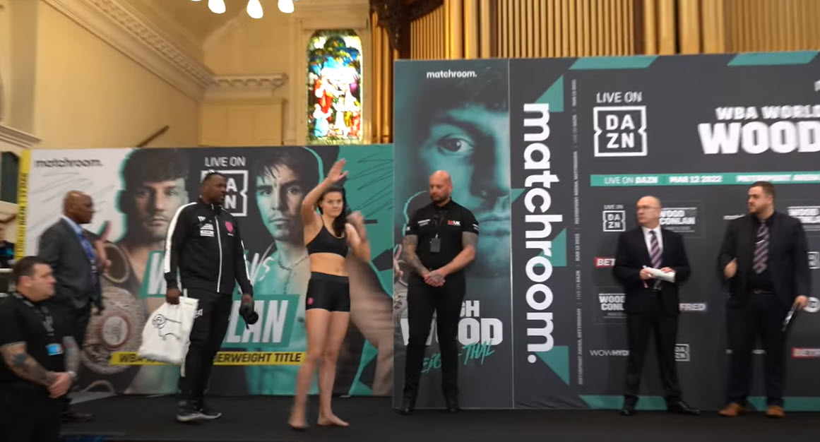 Eski dünya boks şampiyonu Erica Anabella Farias, basın toplantısına üzerinde ülkesinin de bayrağı bulunan kamuflaj ile geldi.