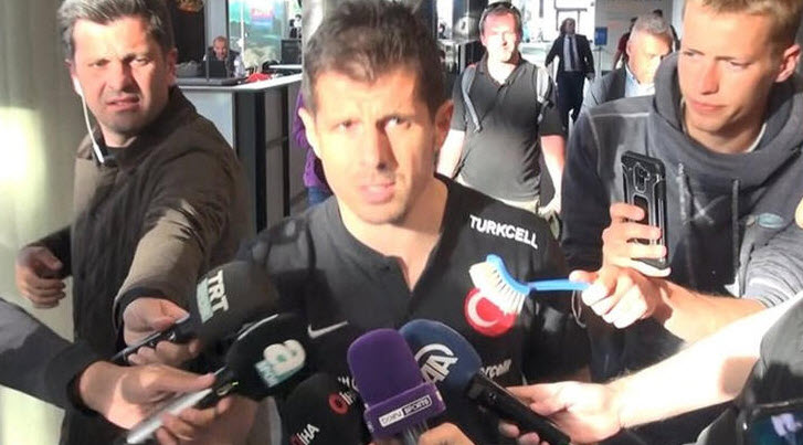 İzlanda'daki, havalimanında gazetecilerin sorularını yanıtlayan tecrübeli futbolcu Emre Belözoğlu'na, bir vatandaşın mikrofon tutar gibi tuvalet fırçası uzatması infial yaratmıştı.