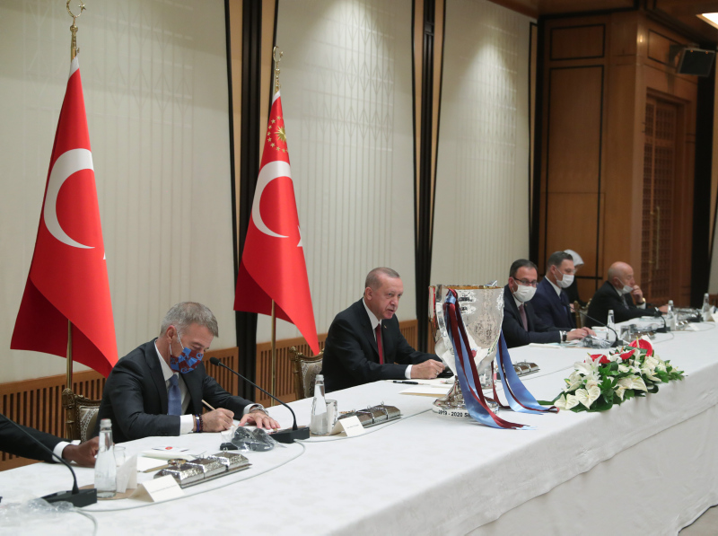 Başkan Recep Tayyip Erdoğan, Cumhurbaşkanlığı Külliyesi'nde Trabzonsporlu futbolcular, teknik heyet ve yönetimi ağırladı.
