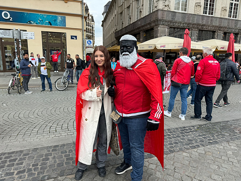 Tezahüratlar yapan taraftarlar, ardından yürüyüşe geçti. Yaklaşık 2 kilometre yürüyen taraftarlar, maçın oynanacağı Leipzig Stadı'na ulaştı.