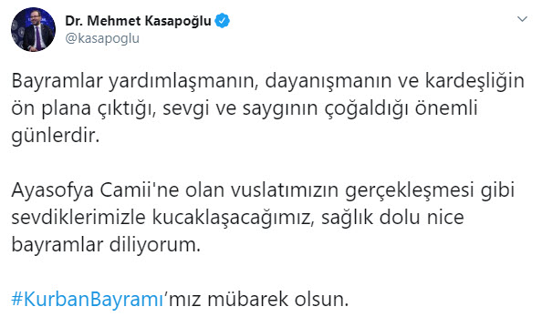 "Ülkemizin ve tüm İslam aleminin Kurban Bayramını en içten dileklerimizle kutlar, mutlu, huzurlu ve sağlıklı nice bayramlar dileriz."