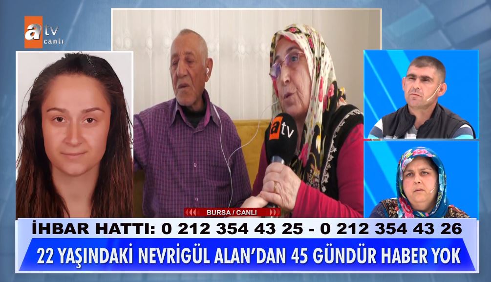 2 Eylül Cumartesi Bursa Gemlik'ten kaybolan 22 yaşındaki Nevrigül Alan'dan 45 gündür haber alınamaması üzerine Nevrigül'ün annesi babası ve kız kardeşi soluğu Müge Anlı'da aldı. Ailenin iddiasına göre; iki çocuğundan biri ayrılmak istediği eşinde olan Nevrigül, çocuğunu görmek amacıyla evden ayrıldı. Nevrigül'den o günden itibaren bir daha haber alınamadı.