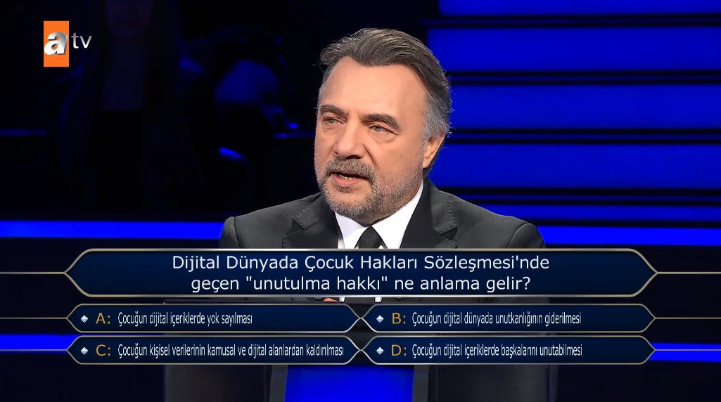 ATV'nin sevilen bilgi yarışması Kim Milyoner Olmak İster son bölümünde, dijital çağın en önemli konularından birine dikkat çekti. Yarışmada sorulan "Dijital Dünyada çocuğun 'unutulma hakkı' ne anlama gelir?" sorusu, izleyiciler arasında da merak uyandırdı.