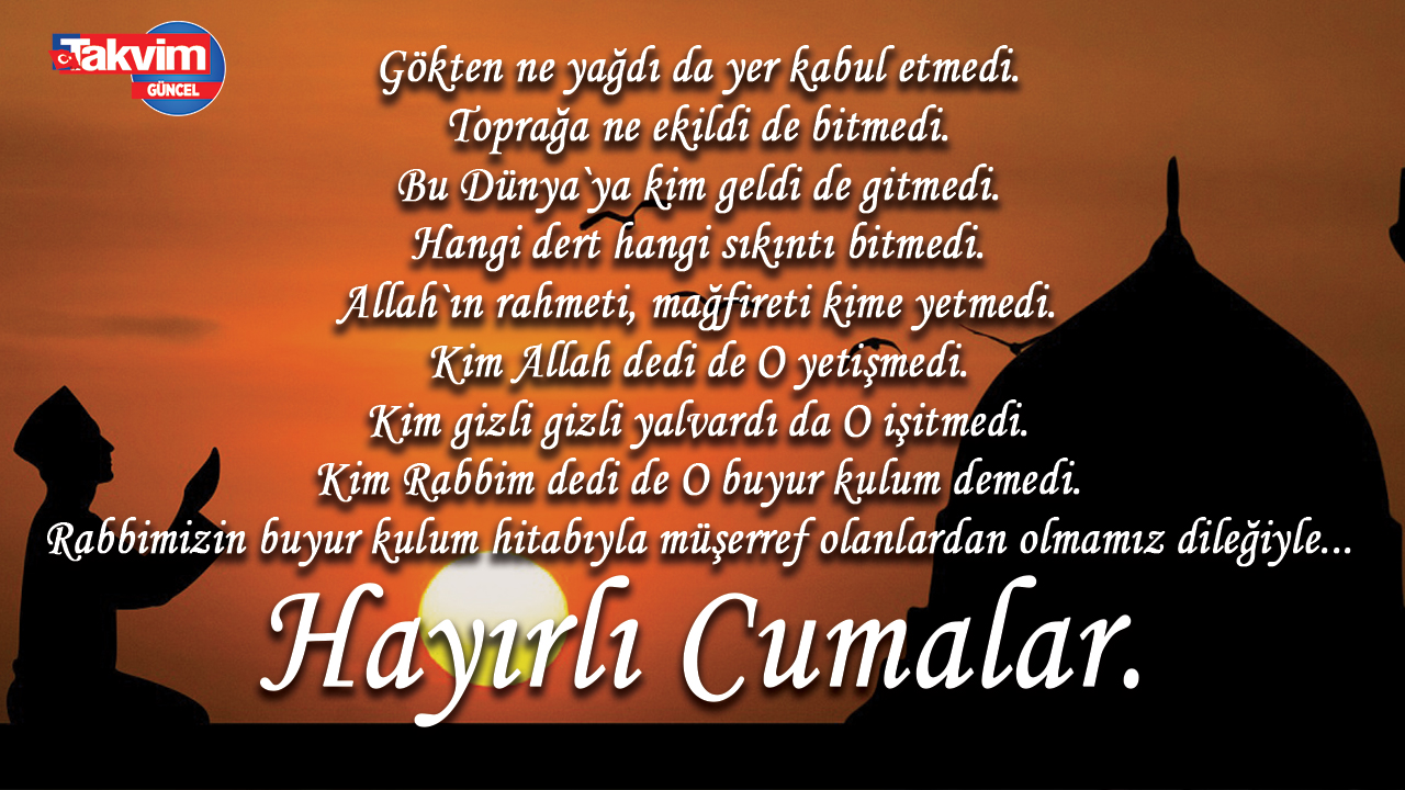 Yükü sevgi, özü saygı, gücü barış, süsü hoşgörü olan mübarek dinimizin seçtiği haftanın özel günü olan Cumanızı kutlarım.