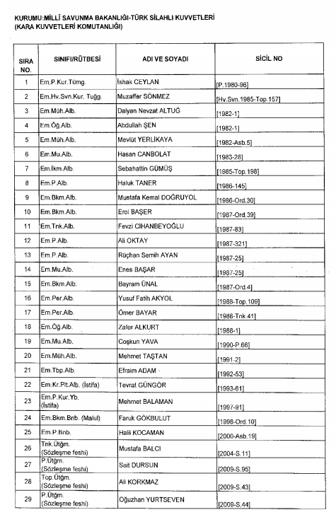 692 Sayılı Kanun Hükmünde Kararname (KHK) ile rütbeleri alınan emekli TSK personeli listesi