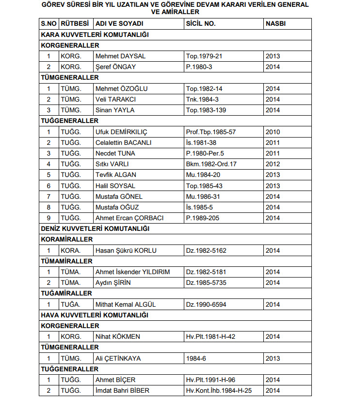 Görev süresi uzatılan General ve Amirallerin, bir üst rütbeye terfi ettirilen General/Amiral ve Albayların, hizmet süresi 2 yıl uzatılan Albayların listesi açıklandı..