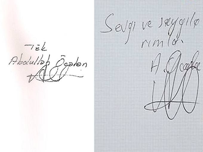 Öcalan’ın, 'Sevgi ve saygılarımla. A. Öcalan' yazdığı notun altına attığı imza ile 1969 yılında Diyarbakır Kadastro Müdürlüğü’nde teknisyen olarak çalıştığı dönemde düzenlenen zabıtlara attığı imzaya göre fazla değişmediği görüldü.