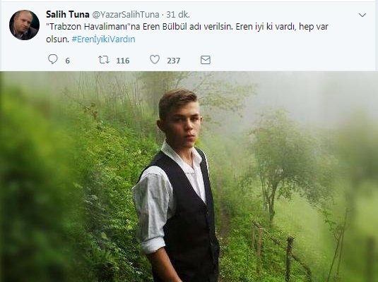Türkiye, 15 yaşındaki Trabzonlu kahraman şehidine ağlıyor. Maçka'da güvenlik görevlilerine yardım etmeye çalışırken şehit olan 15 yaşındaki Eren Bülbül için Twitter'da açılan paylaşım dünyanın dört bir yanından büyük ilgi görüyor. Tüm Türkiye'deki STK'lardan Trabzonlu şehit Eren Bülbül için taziye mesajları geliyor. Şehit haberinin gelmesinin ardından sosyal medyadan mesajlar yağdıran yüzbinlerce Türkiyeli, 15 yaşındaki Trabzonlu şehidine sahip çıktı.
