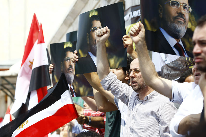 Fatih Camisi avlusunda öğle saatlerinde bir araya gelen grup, ellerinde Mursi'nin fotoğrafları, Mısır bayrağı ile Özgür Suriye Ordusu ve kelime-i tevhid flamaları taşıdı.