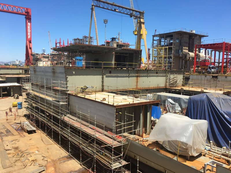 Türkiye'nin gururu olan ilk yerli savaş uçak gemisi Çok Maksatlı Amfibi Hücum Gemisi TCG L400 Anadolu'nun inşası Sedef Tersanesi'nde hızla devam ediyor. Geminin havuzda bloklarının yerleştirilmesi ve çalışmaları (İHA) İhlas Haber Ajansı tarafından havadan görüntülendi.